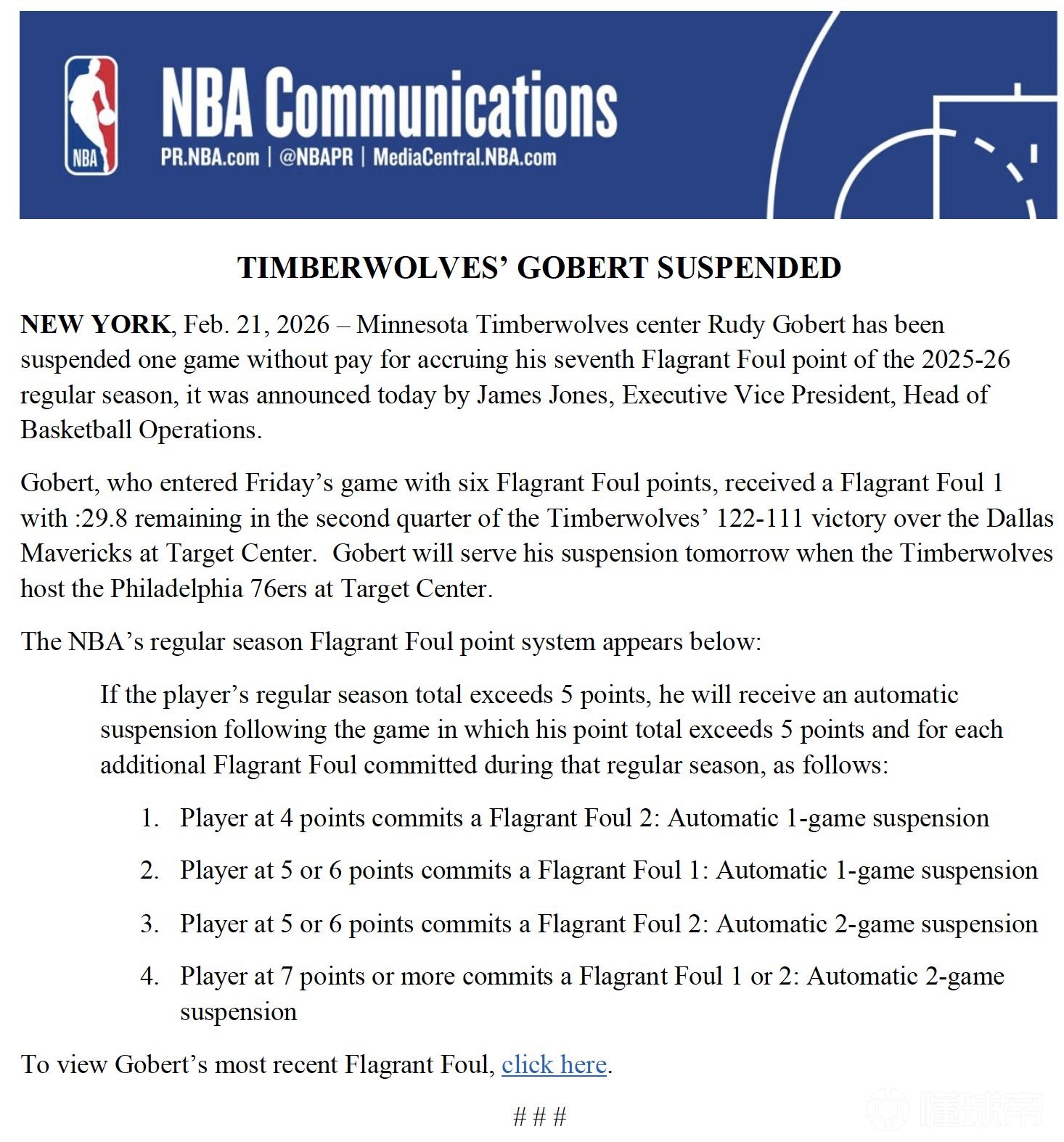 今日,NBA篮球运营执行副总裁兼主管詹姆斯-琼斯宣布,明尼苏达森林狼队中锋鲁迪-戈贝尔因在2025-26赛季常规赛累计获得第7个恶意犯规,被处以禁赛一场且无薪的处罚。