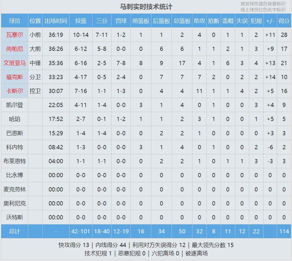 全场结束,马刺114-103击败活塞。马刺豪取9连胜,终结了活塞5连胜。文班亚马16中6,砍下21分17篮板4助攻1抢断6盖帽,正负值+14,第四节单节轰下11分4盖帽!坎宁安26投5中仅得16分6板10助2断3帽3失误,正负值-18。
