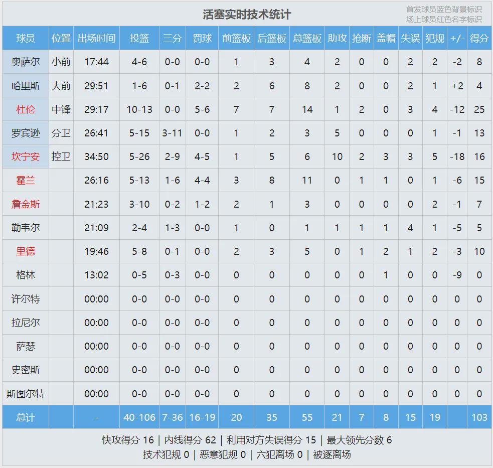 第四节决战,坎宁安很快吃到第5次犯规。不仅如此,末节文班连续送给坎宁安2记大帽,马刺一度领先到15分。眼看比赛要花,杜伦站出来连造文班两次犯规,包括一记隔扣2+1。最后3分钟,马刺仍然领先10分,活塞翻盘失败了。