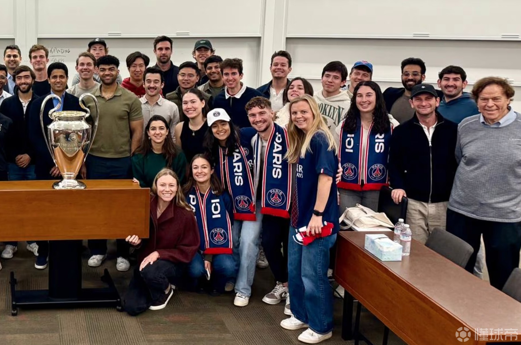 在案例发布前,上周五,巴黎圣日耳曼主席纳赛尔到访斯坦福大学校园,与参与研究的教授和学者会面,并为商学院学生发表荣誉讲座。斯坦福大学全球商业与经济学丹宁教授、美国前国务卿康多莉扎-赖斯亦出席活动。现场70余名学生与欧冠奖杯合影留念。