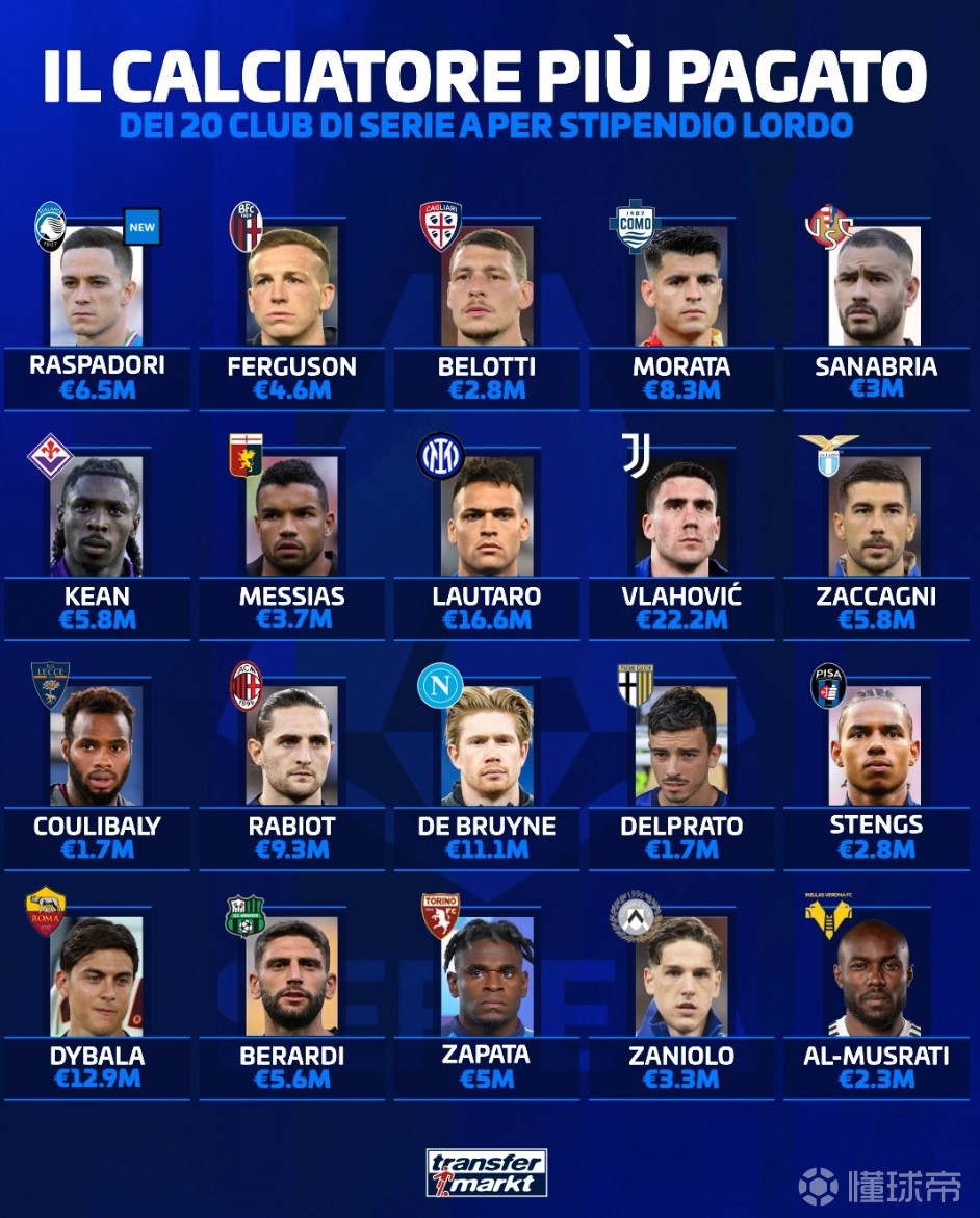 意甲20家俱乐部队内顶薪: