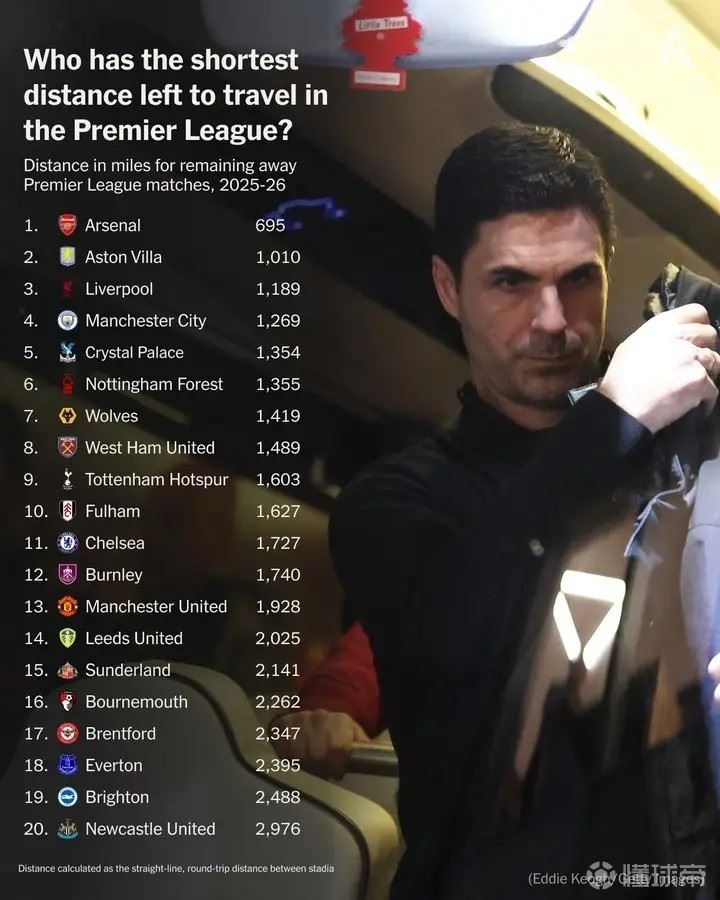 英超联赛26轮战罢,争冠局势将进入白热化阶段。日前,The Athletic计算了英超各支球队剩余联赛赛程的客场旅程总距离,结果显示阿森纳是20支英超球队中,本赛季剩余旅程最短的球队。