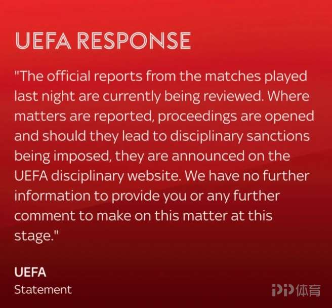 昨晚赛事的官方报告正处于审核阶段。如发现违规问题,将启动相关程序;若最终作出纪律处罚,相关结果将在欧足联纪律委员会官网公布。目前,我们暂不提供更多信息,也不就此事发表进一步评论。