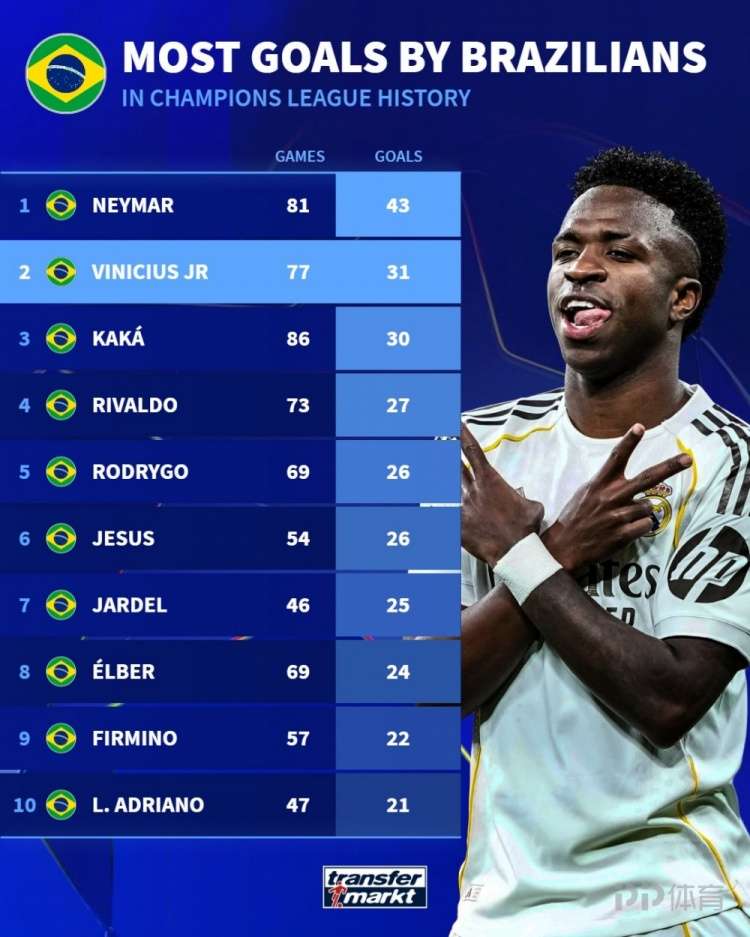 德国转会市场统计了巴西球员在欧冠的进球数量,并列出欧冠历史巴西球员射手榜,内马尔43球居首,维尼修斯31球次席。