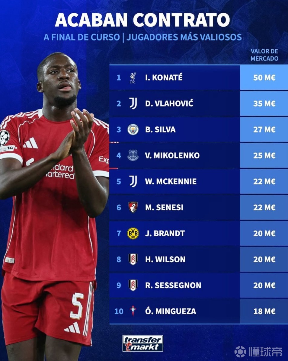 北京时间2月20日,德转列出了现有合同今年6月到期德转身价最高的10名球员,利物浦中卫科纳特以5000万欧元排名第一,尤文图斯前锋弗拉霍维奇3500万欧元第二,曼城队长伯纳多-席尔瓦2700万欧元第三。