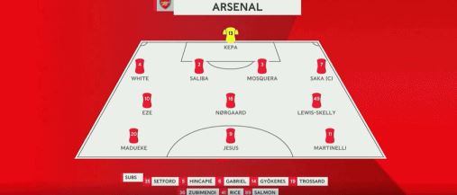 萨卡顶替受伤的卡拉菲奥里首发,转播阵型显示位置为左后卫