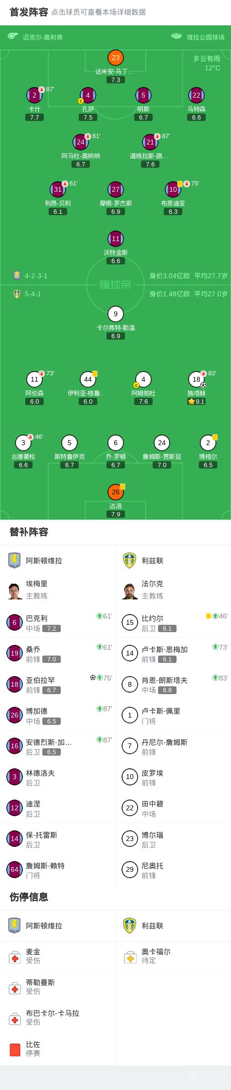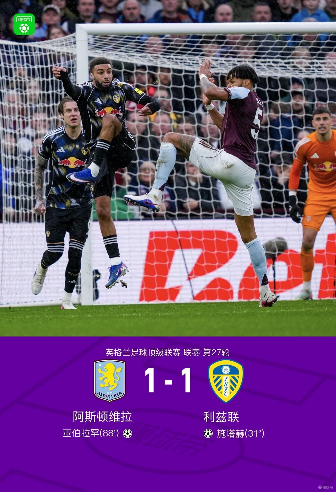阿斯顿维拉1-1利兹联,施塔赫任意球破门,亚伯拉罕扳平