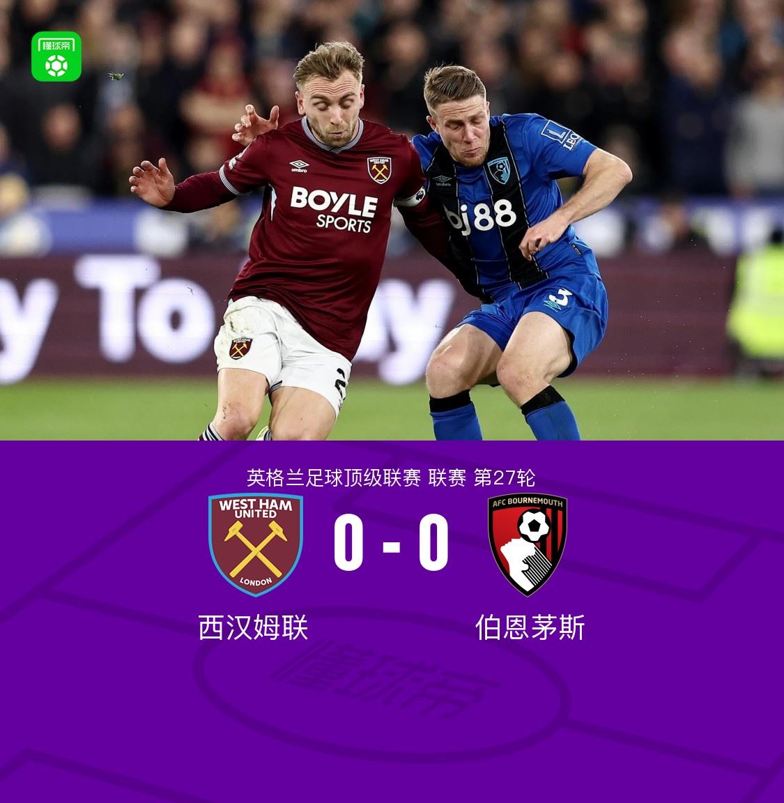 北京时间2月22日,英格兰足球顶级联赛第27轮,西汉姆联主场对阵伯恩茅斯。比赛中,拉扬一条龙奔袭打门中框。最终,双方互交白卷。