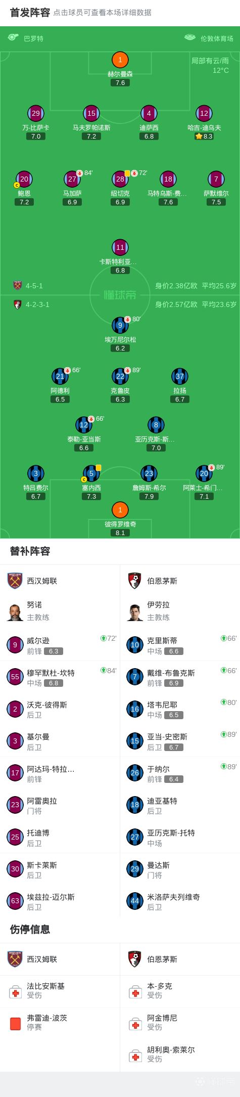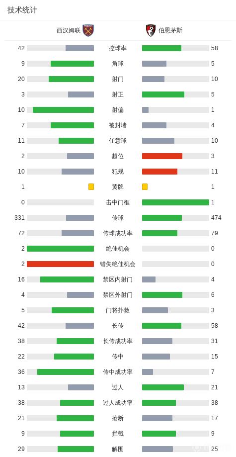 西汉姆联0-0伯恩茅斯,拉扬一条龙奔袭中框