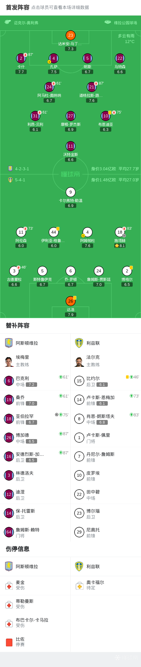 阿斯顿维拉1-1利兹联,施塔赫任意球破门,亚伯拉罕扳平