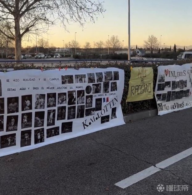 当地时间2月20日,皇马球迷在皇马体育城外悬挂横幅,声援维尼修斯与姆巴佩,力挺二人反对种族歧视的行为。