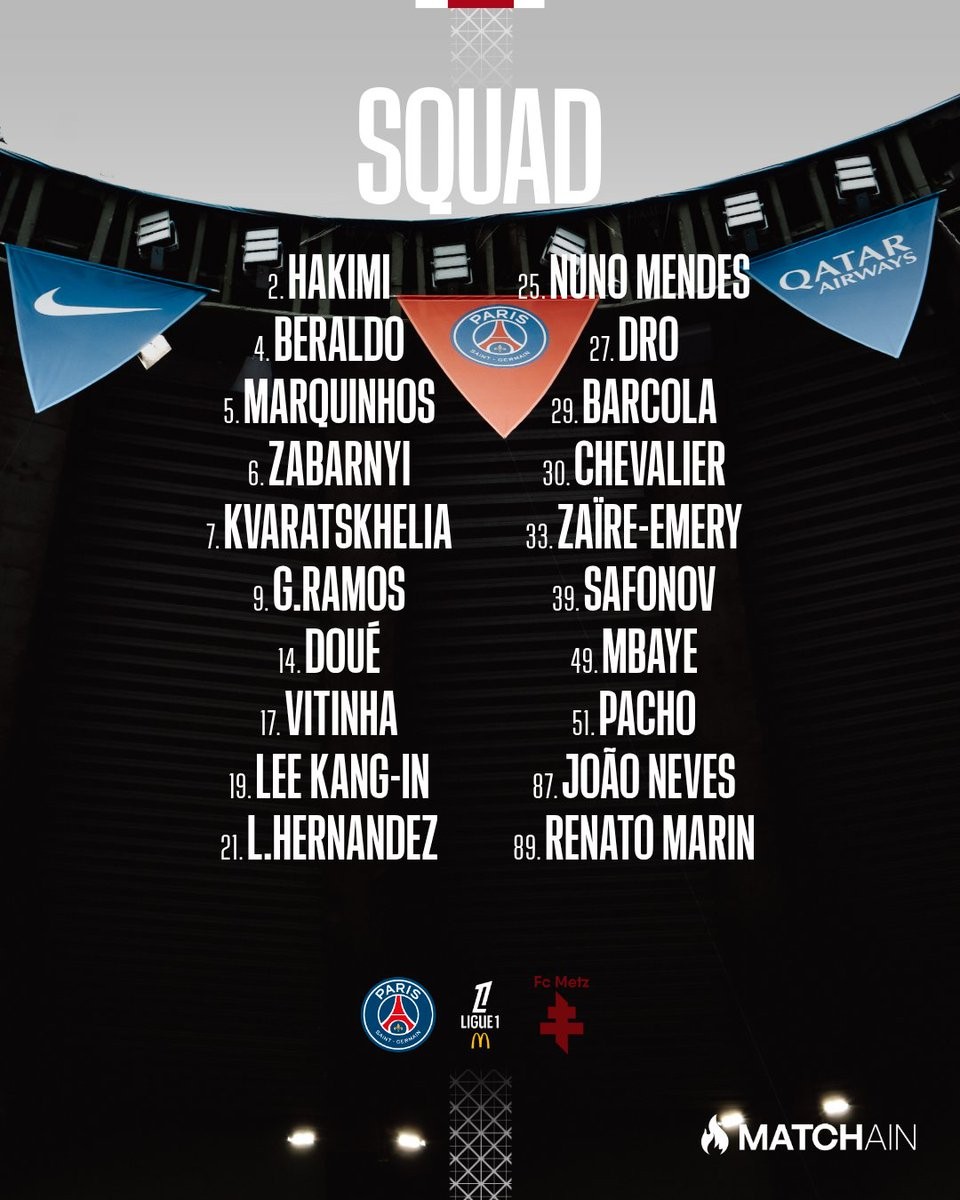巴黎圣日耳曼官方公布了法甲第23轮主场对阵梅斯的比赛大名单,登贝莱、鲁伊斯缺阵。